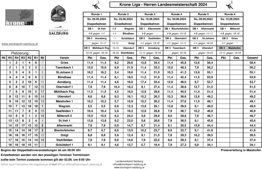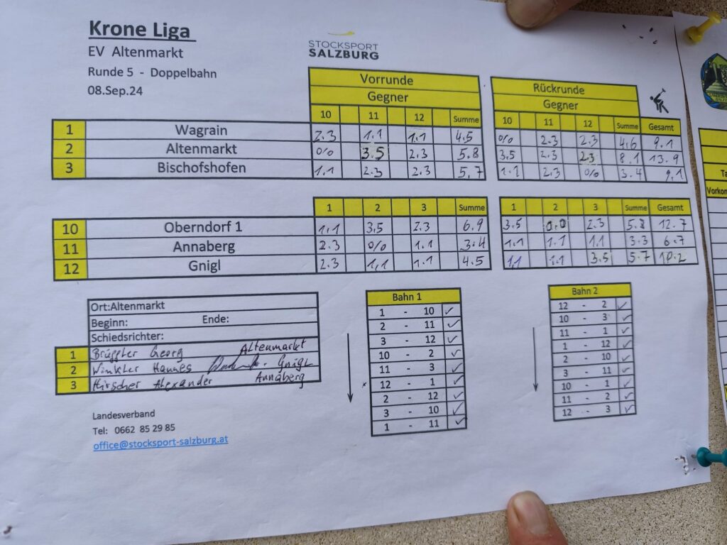 Am 8. September fand bei uns in Altenmarkt die 5. Meisterschaftsrunde der Kronenliga statt. Dieses Mal konnte unsere Mannschaft den Heimvorteil richtig gut nützen. Alle Teammitglieder spielten sehr gut und holten mit 13,9 Punkten den Tagessieg. Mit diesem Sieg konnten wir uns in der Kronenliga-Tabelle wieder etwas nach vorne arbeiten. In der 6. und letzten Meisterschaftsrunde, am 15.9.2024 in Mittersill, geht es für unsere Mannschaft darum den Klassenerhalt zu sichern. Top motiviert durch den neuen Aufwind werden alle Mannschaftsspieler ihr bestes dafür geben in der Königsklasse zu bleiben. Stock heil.