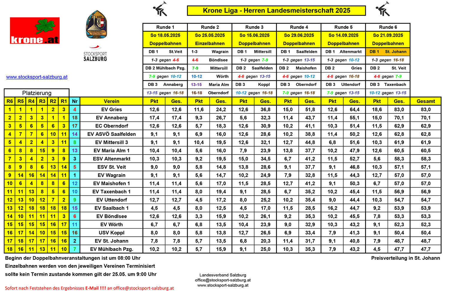 Am 21. September fand in St. Johann die sechste und letzte Meisterschaft der Kronen Liga statt. Nach einer soliden Vorrunde mit 4,5 Punkten lagen wir im Mittelfeld und kämpften noch um den 2. oder 3. Platz.