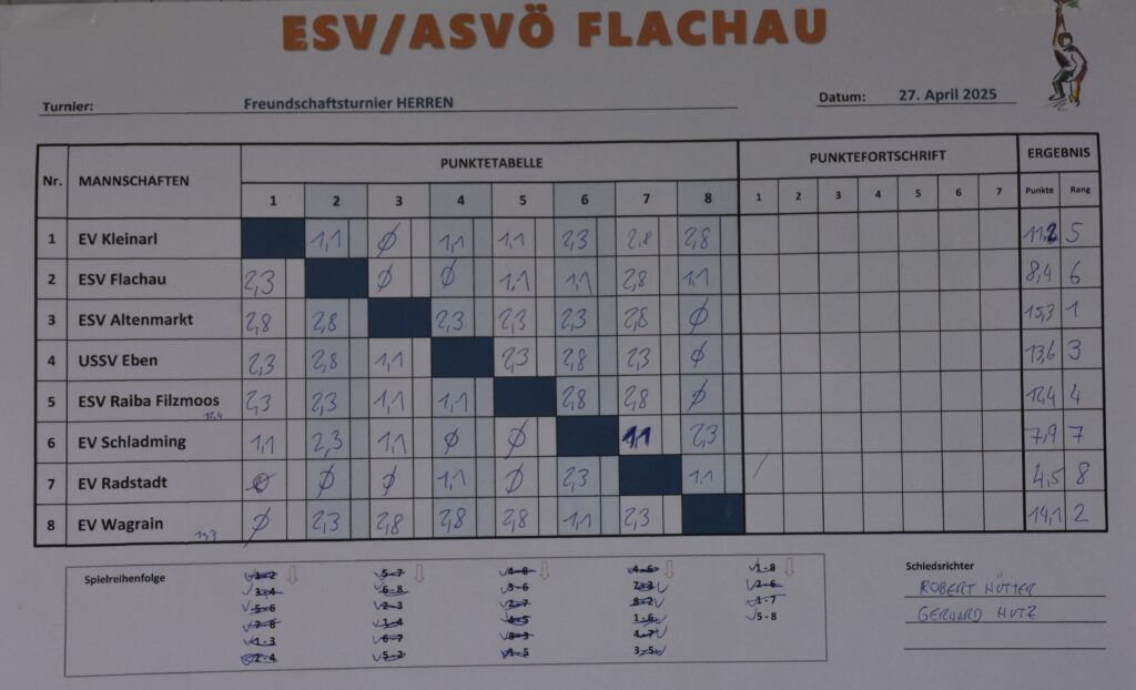 Am 27. April 2025 wurde unsere Mannschaft zum Frühjahrs-Turnier nach Flachau eingeladen. Die Mannschaft ergriff diese Gelegenheit und konnte mit 15.3 Punkten den Sieg einspielen.