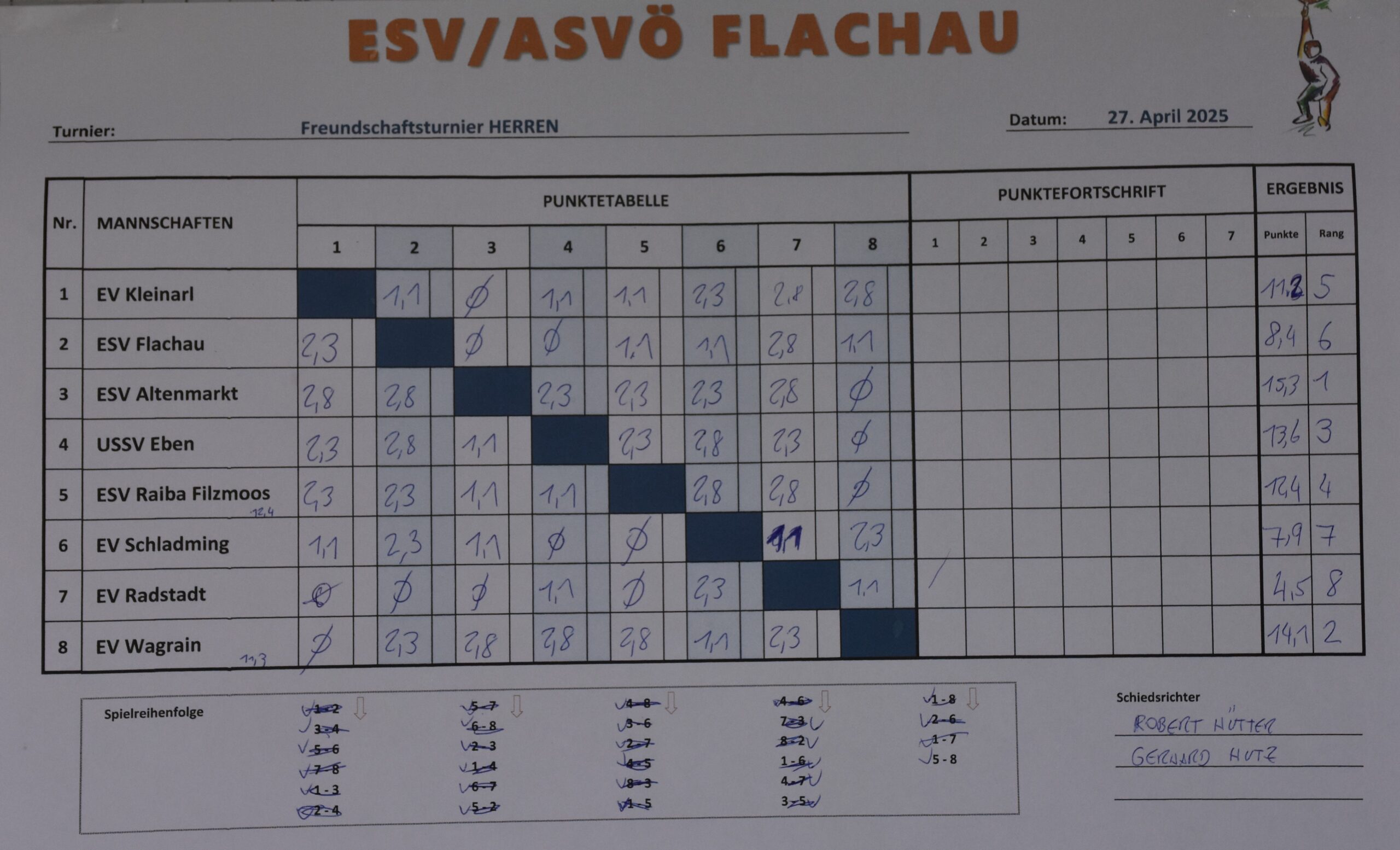 Am 27. April 2025 wurde unsere Mannschaft zum Frühjahrs-Turnier nach Flachau eingeladen. Die Mannschaft ergriff diese Gelegenheit und konnte mit 15.3 Punkten den Sieg einspielen.
